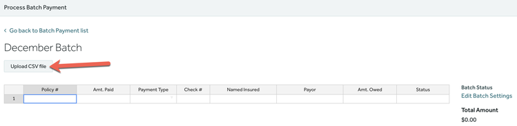 Batch payments are configured to use policy number as the primary field by default. To add an entry to batch by policy number, input the policy number into the Policy #column.