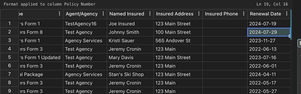 Rows may be resized, and row formats can be changed by using the stacked-dots menu and selecting the desired format. Arrows can be used to scroll to fields that are too wide to fit in the visible area.