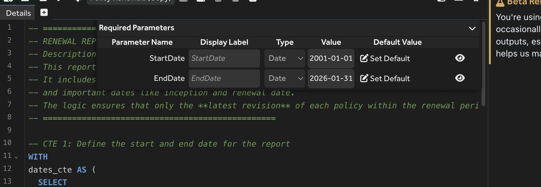 The parameters area detects templated placeholders and prompts for runtime values. In mature reporting workflows, this is where report reusability is defined, so parameter names and typing conventions should be treated as part of the report contract.