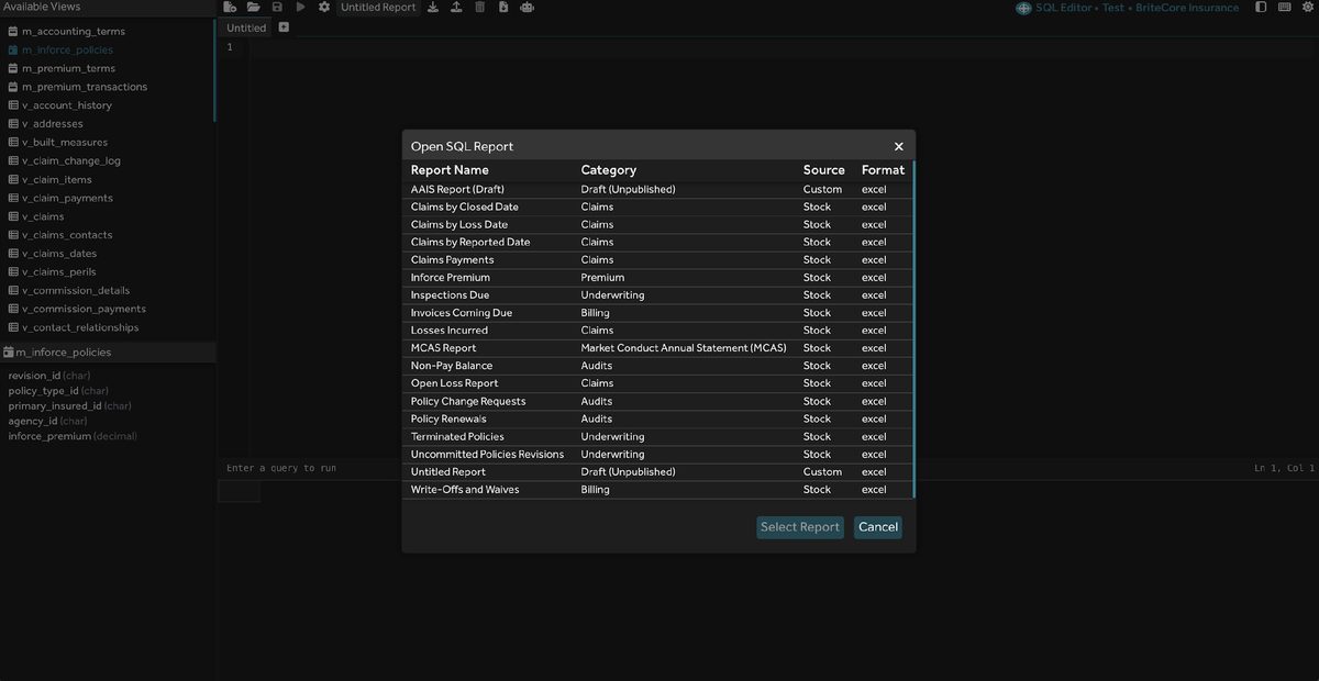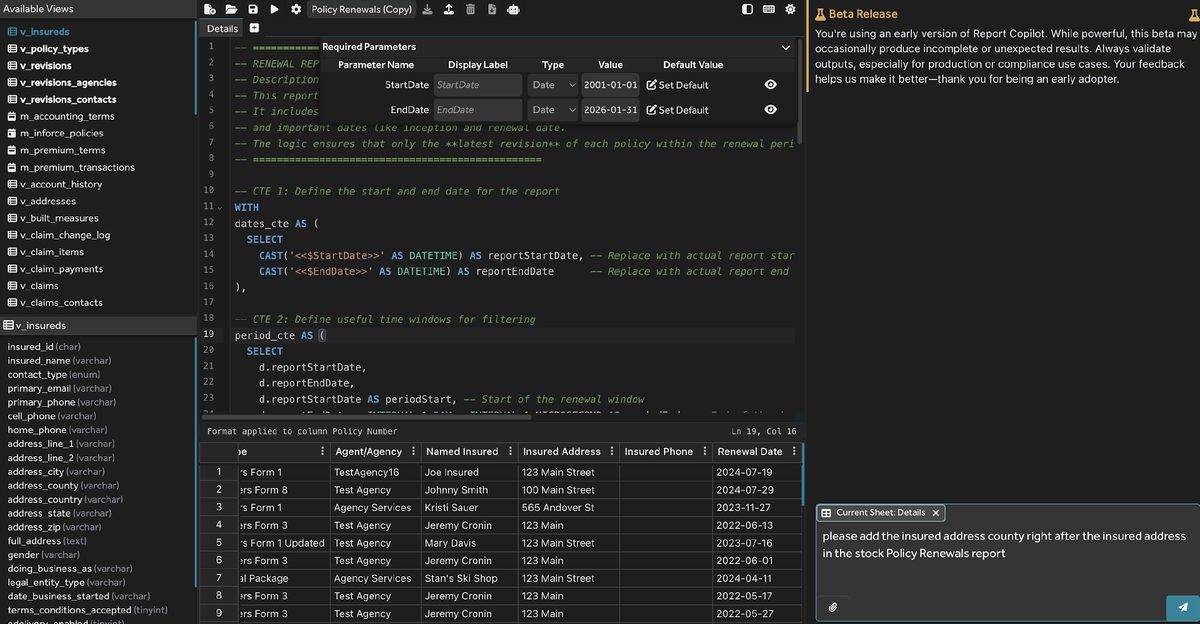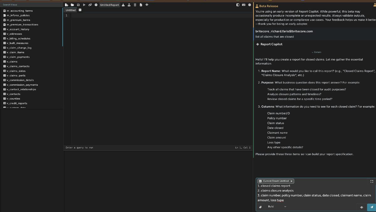 In this use case, BriteCore has a similar report and you desire to make slight modifications to it. It is easiest to open the report in the editor and run it once manually, so you can see the outputs in its standard configuration. Then tell the Report Writer in english what you want to do, such as:
