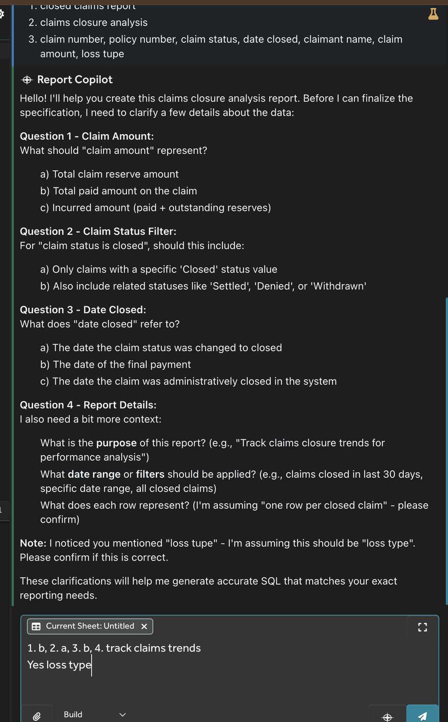The report copilot will prompt for the report name, report purpose, and any other clarifying addition it needs. Please answer these prompts and then it will describe its plan for the report and ask for your confirmation. Once you confirm it will build the report, and as it is generating the report