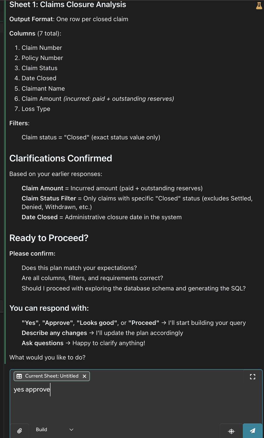 Building a report in Data Exploration mode is very similar, except the tool uses all of its knowledge to infer the answers to all of the aforementioned questions. Rather than asking, it chooses fields it believes relevant to the query, picks the filter that chooses rows by what it believes the most likely interpretation of your English is, and gives you a result based on that. You can ask the agent to modify its assumptions and guide it to the report or insights you need.