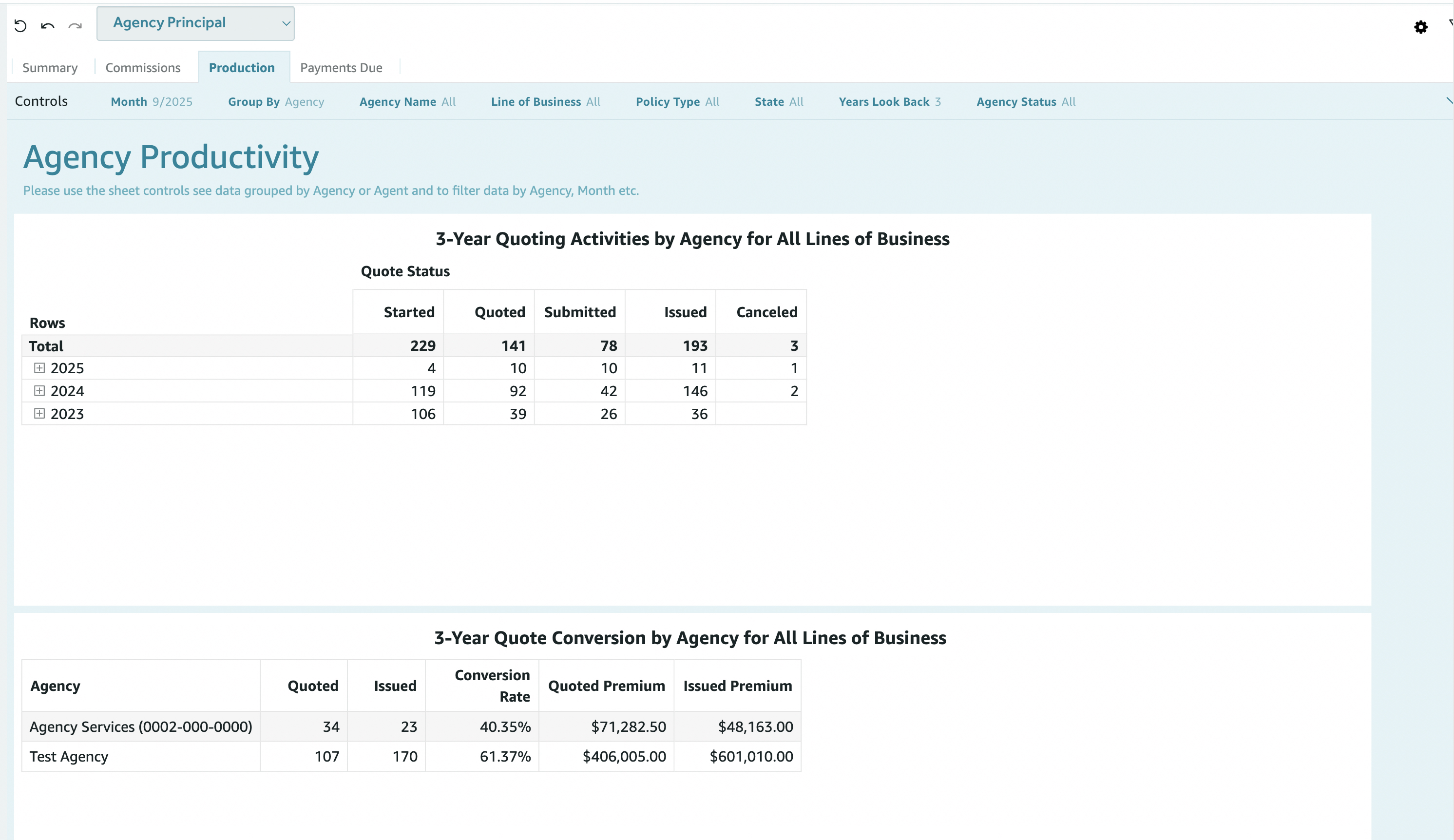 The Agency Principal dashboard gives an agency-focused viaw of commissions, production, payments due, and summary metrics. It has four tabs: Summary, Commissions, Production, and Payments Due. On every chart, filtering, sorting, export to CSV or Excel, and expand to full screen are available, see Chart options (all dashboards) in the main doc.
