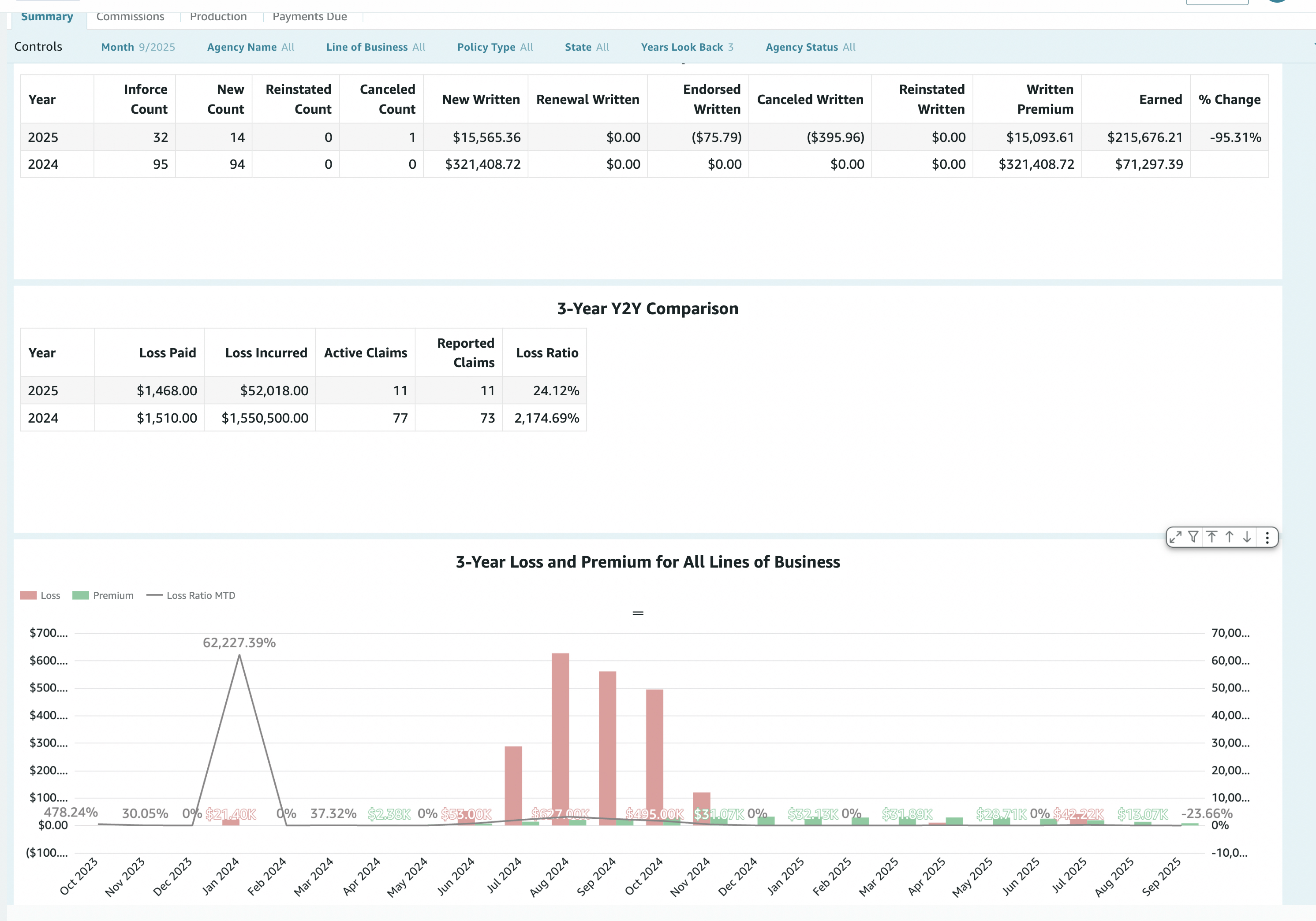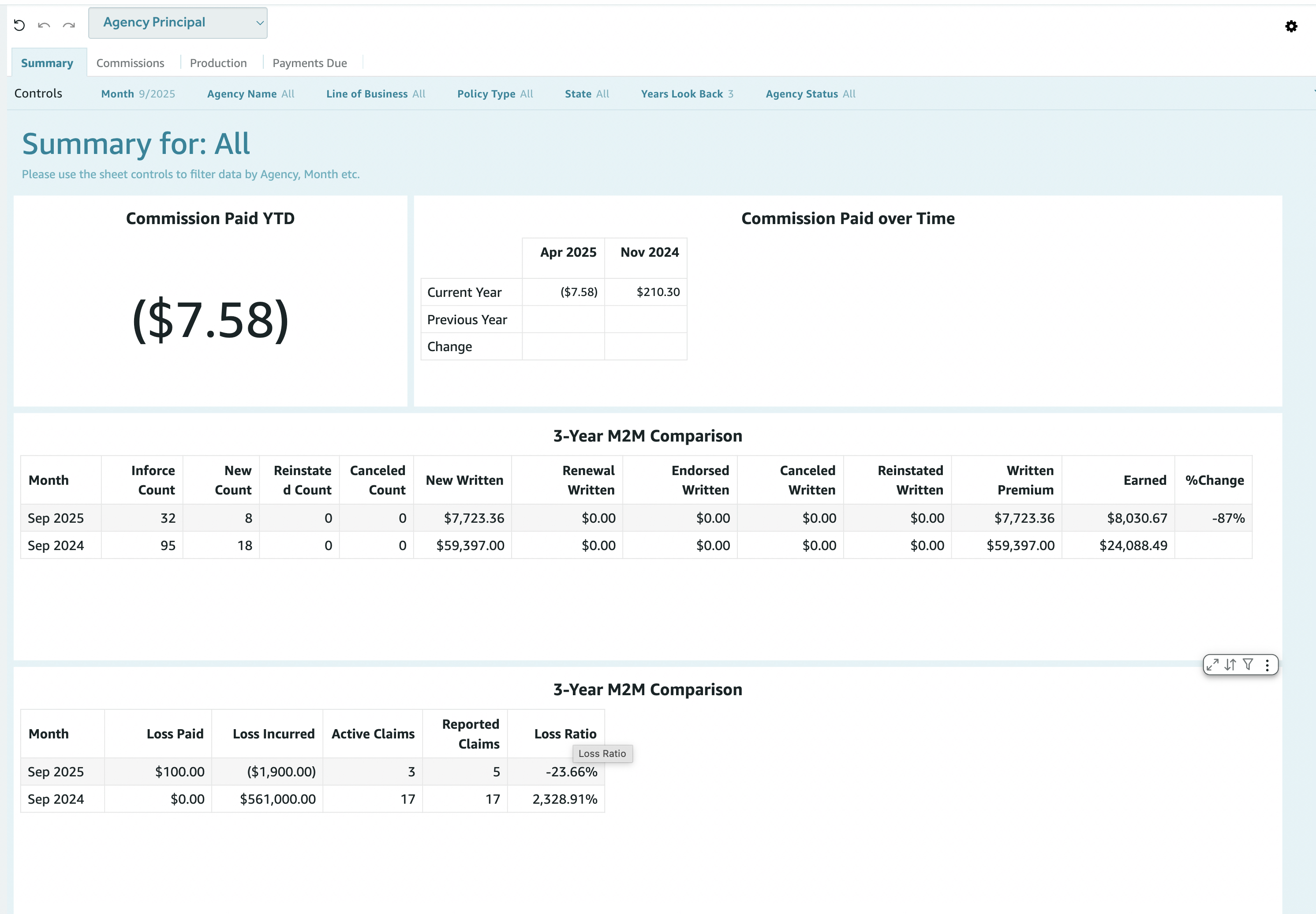Why this tab helps: Track commission and loss trends over time with YTD and multi-year comparisons. Use it to plan ahead, compare this year to last, and have a single “state of the agency” view for yourself or your carrier.