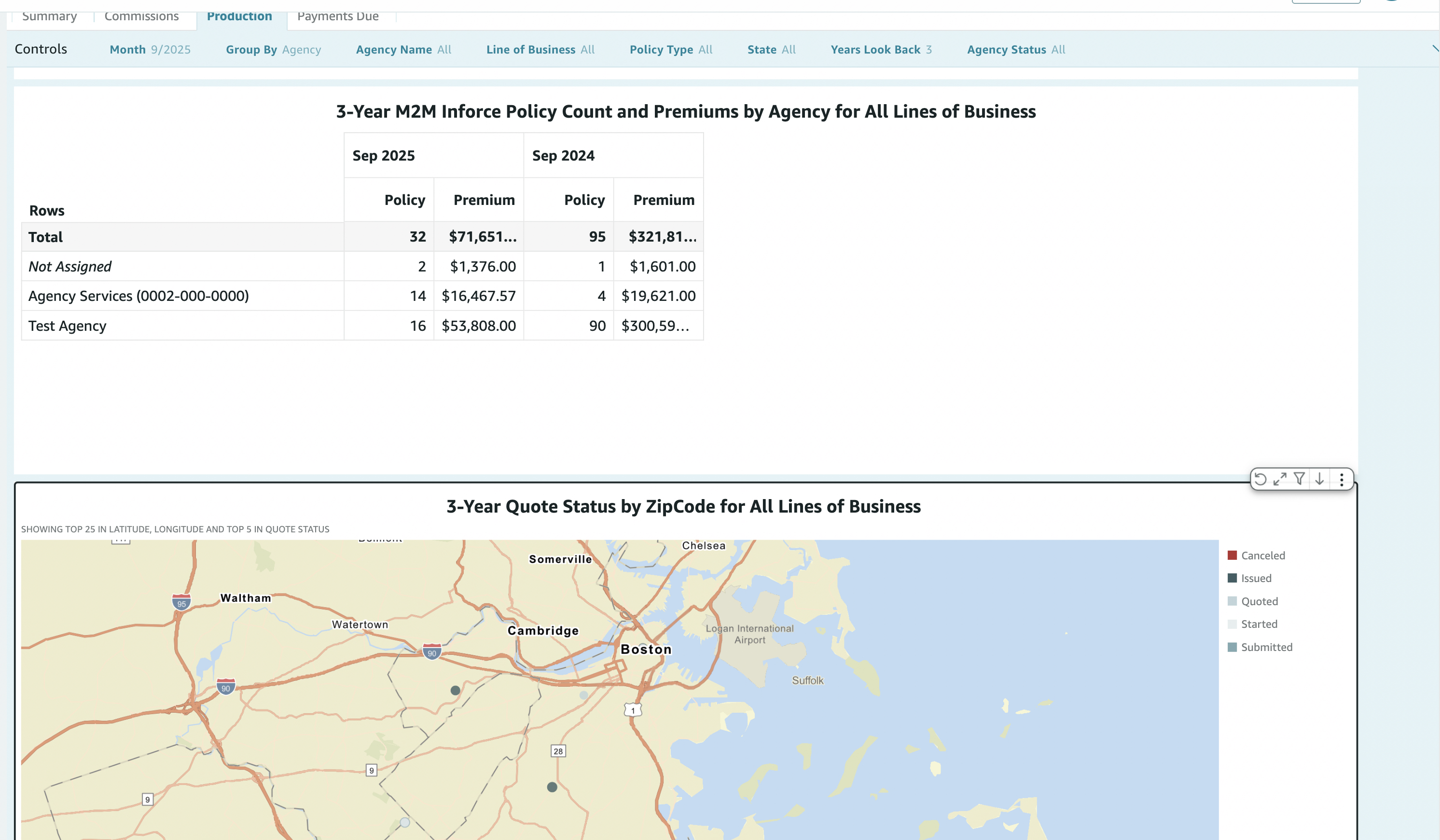 Why it matters (Agency Principal): Track how the book is growing or shrinking by agency and month, so you can manage to target and report to the carrier. - 3-Year Quote Status by ZipCode for All Lines of Business
