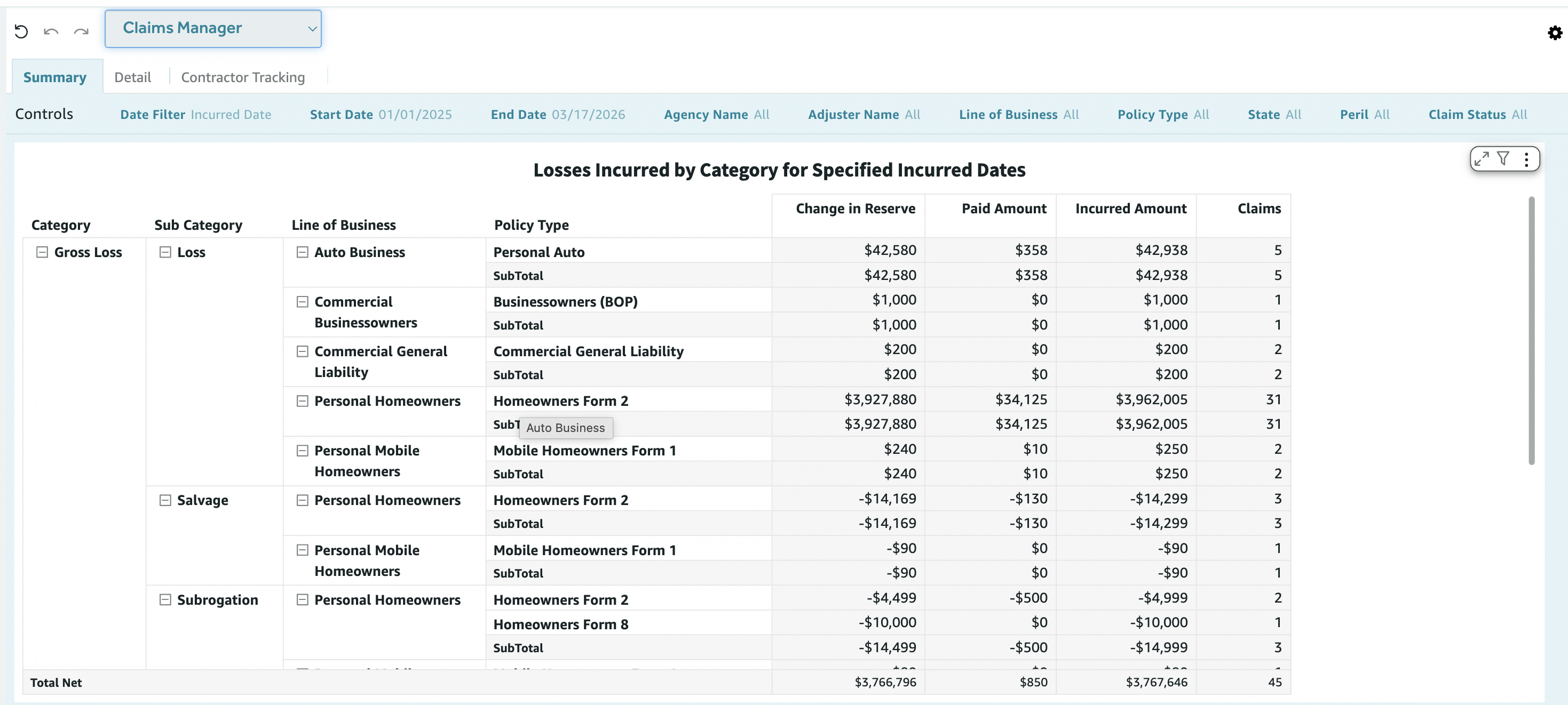 Subtotals appear by line of business; a Total Net row summarizes Change in Reserve, Paid Amount, Incurred Amount, and Claims. The table supports layout and filter options in the header.