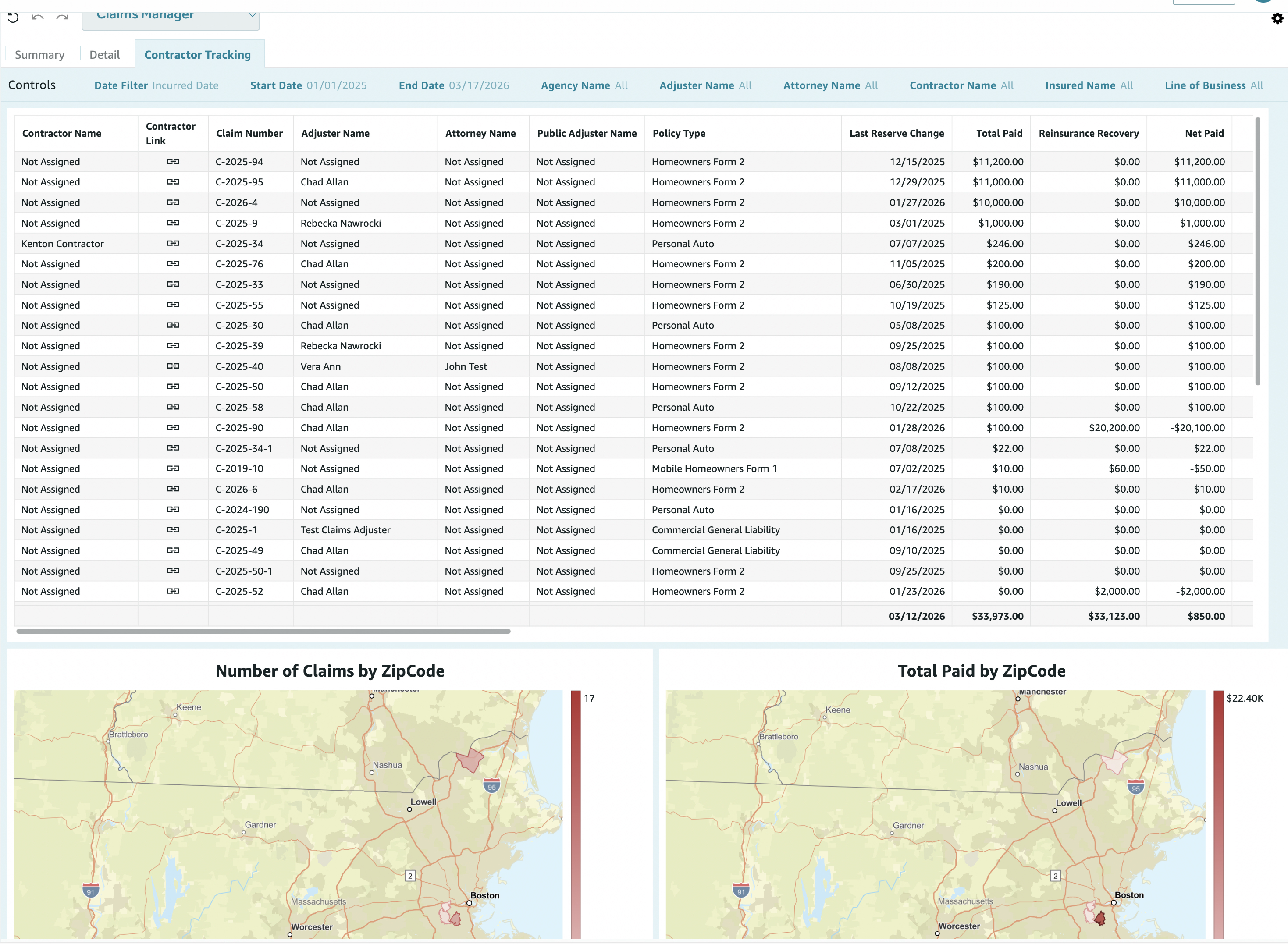 Why this tab helps: See which claims use contractors, attorneys, or public adjusters, and how that ties to paid and incurred amounts. Use it to manage vendor assignments, spot patterns in outside rep usage, and keep contractor and legal spend aligned with outcomes. Some carriers mark contractors that they need to either avoid for future contracts or study their work more closely.
