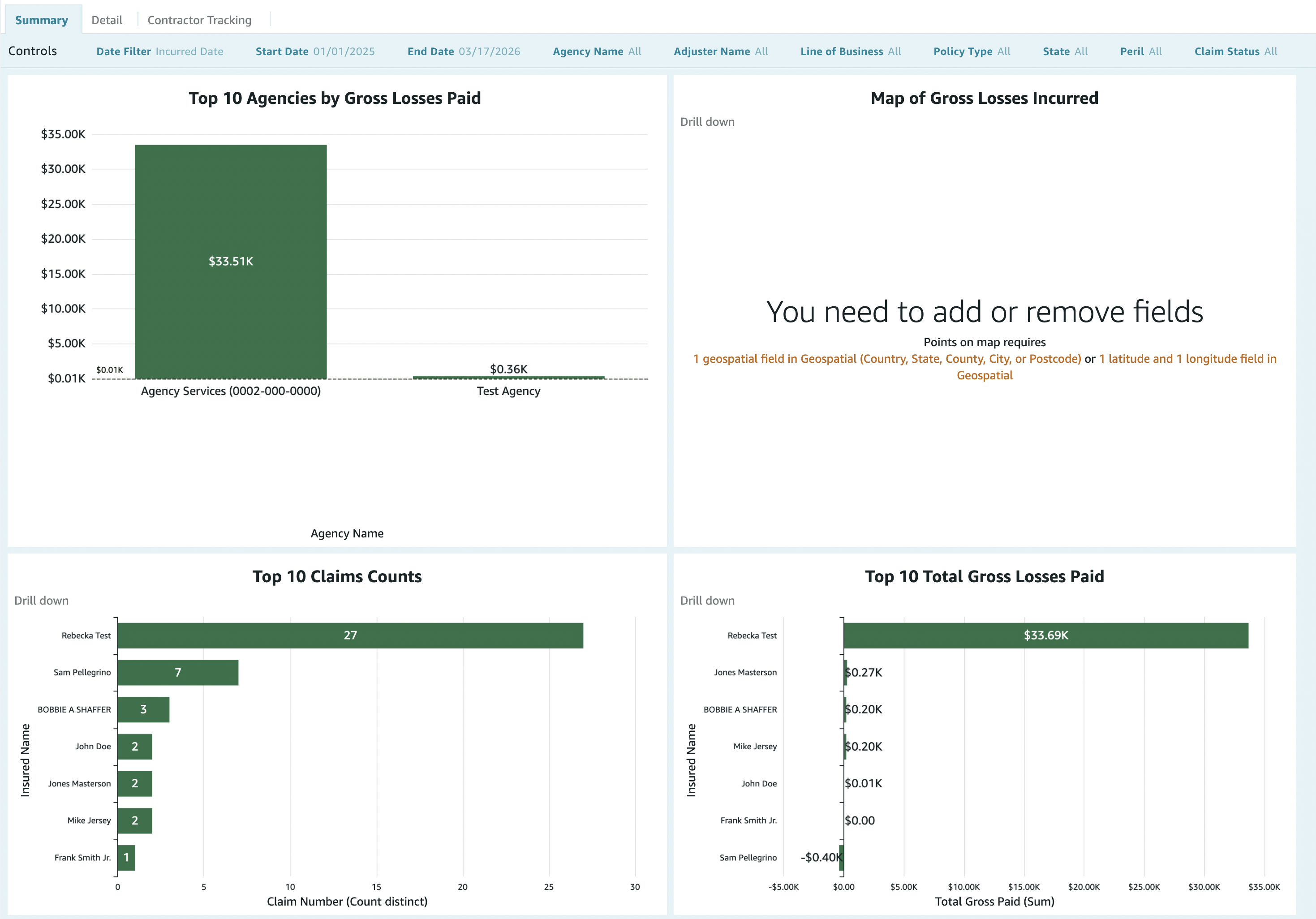 The Summary tab focuses on losses by category, agency performance, and claim counts.