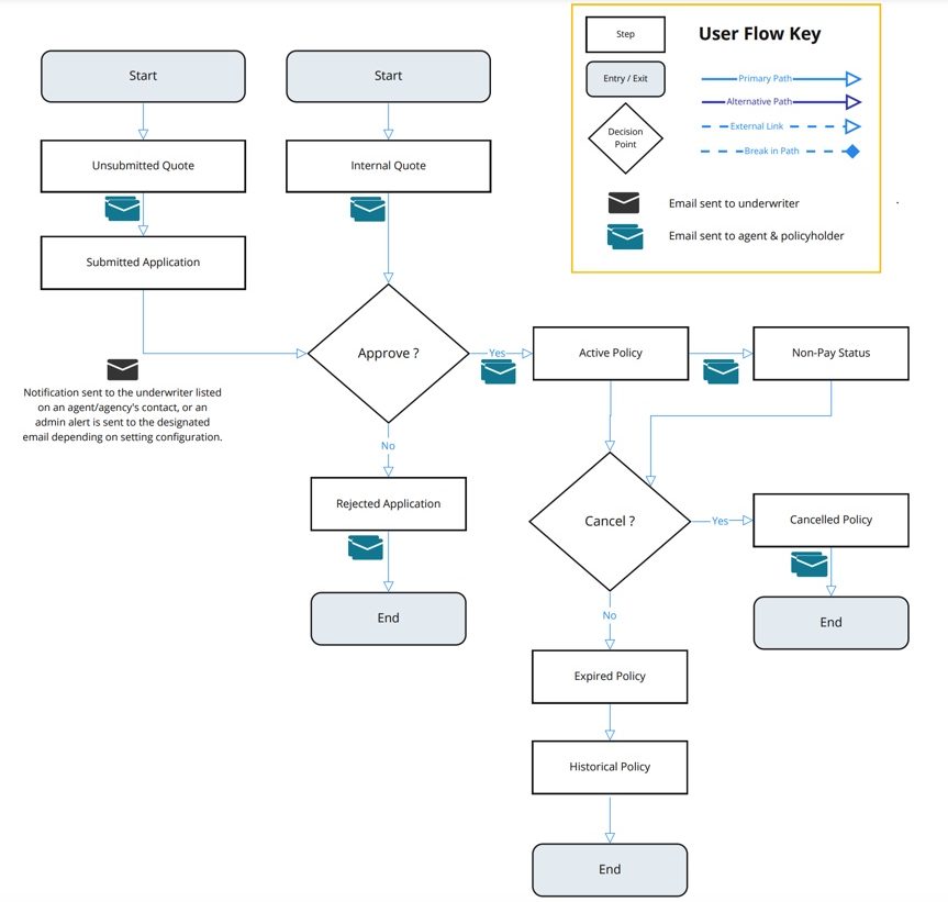 The diagram below illustrates a typical policy lifecycle. The payment-related notifications are listed under Billing.